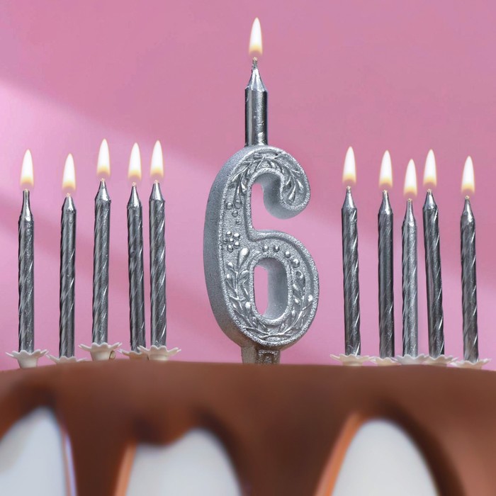 Набор свечей для торта (2 в 1) серебряный узор Цифра 6 + Свечи «С Днём Рождения» 10 шт., 12.5 см 71