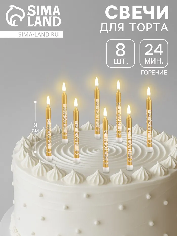 Свечи в торт «С днем рождения», 9 см, 8 шт., 24 мин, золотой металлик