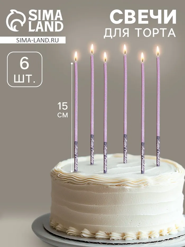 Свечи для торта, 6 штук «Лавандовый металлик», 15 см
