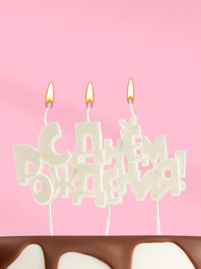 Свеча в торт на шпажках «С днем рождения», жемчужный перламутр