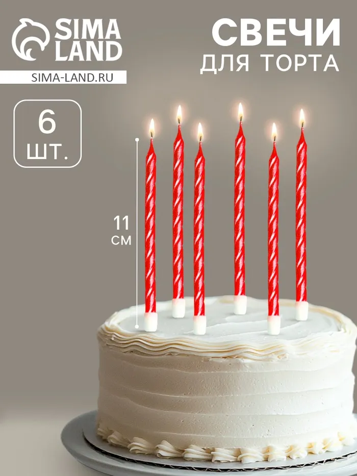 Свечи в торт витые с подставкой, 6 шт., 11 см, рубиновые