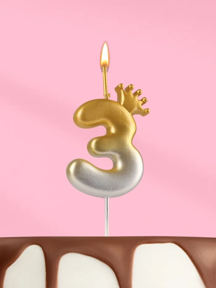 Свеча в торт «С короной», цифра 3, золото - серебро