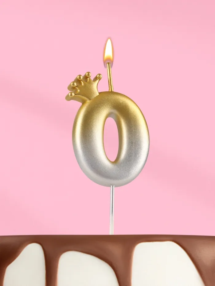 Свеча в торт «С короной», цифра 0, золото - серебро