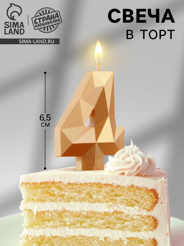 Свеча в торт «Алмаз» цифра 4 золотая, 6.5 см