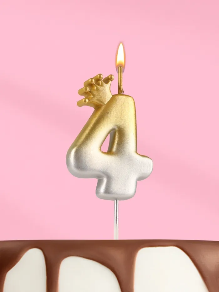 Свеча в торт «С короной», цифра 4, золото - серебро