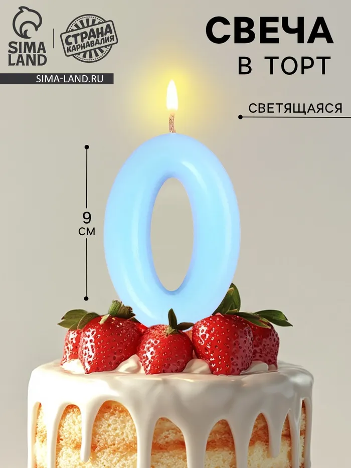 Свеча в торт «Цифра 0», светящаяся голубая, 9 см