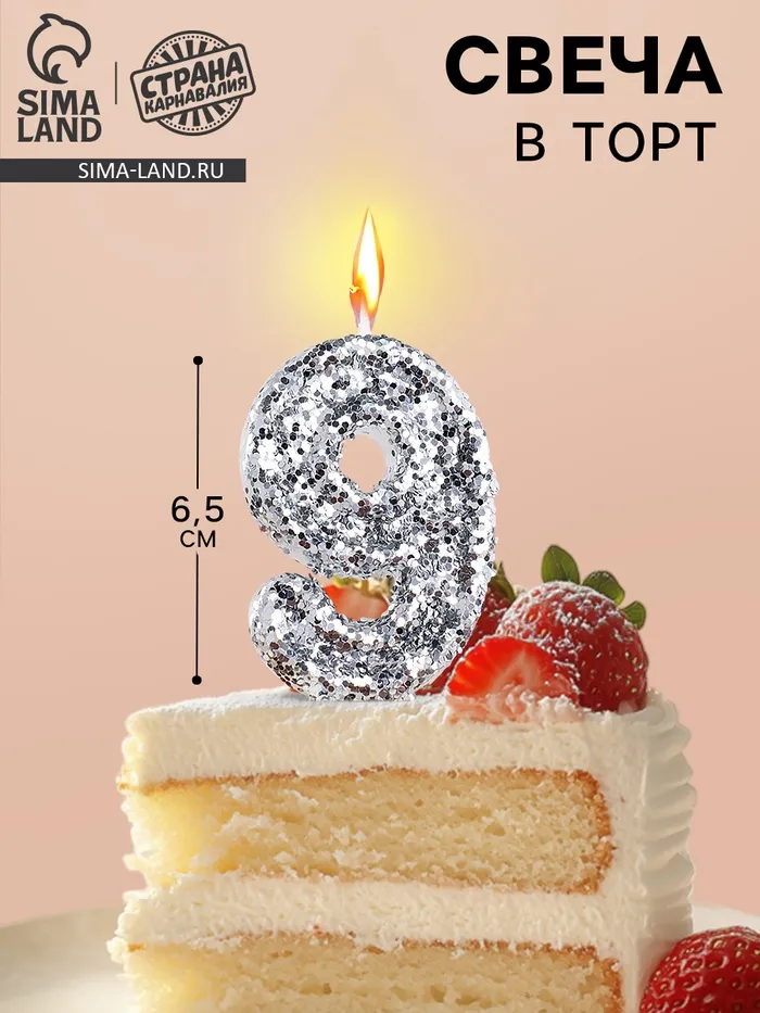 Свеча в торт с блестками «Цифра 9», 6.5×4 см, серебряная