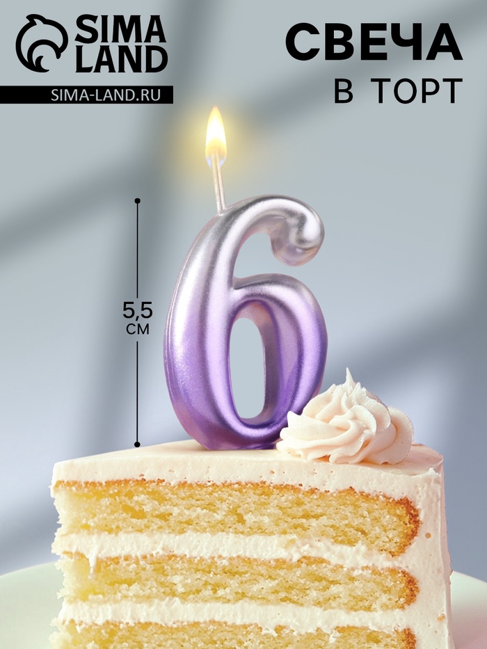 Свеча для торта «Овал», цифра 6, 5.5 см, серебро-сирень