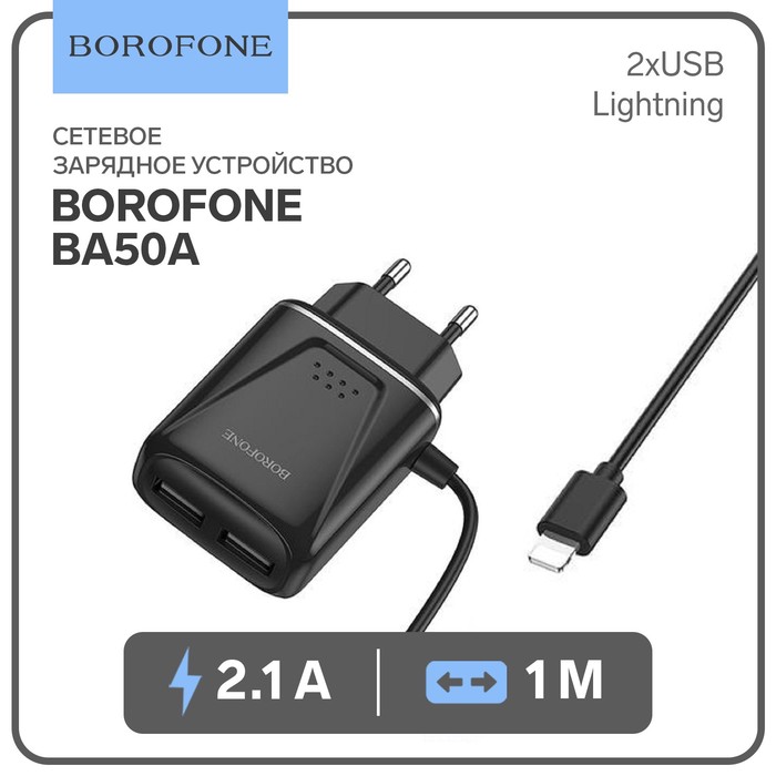 Сетевое зарядное устройство Borofone BA50A, 2хUSB, 2.1 А, кабель Lightning, 1 м, черное