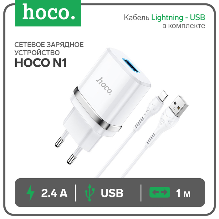Сетевое зарядное устройство Hoco N1, 1 USB, 2.4 А, кабель Lightning - USB, 1 м, белое
