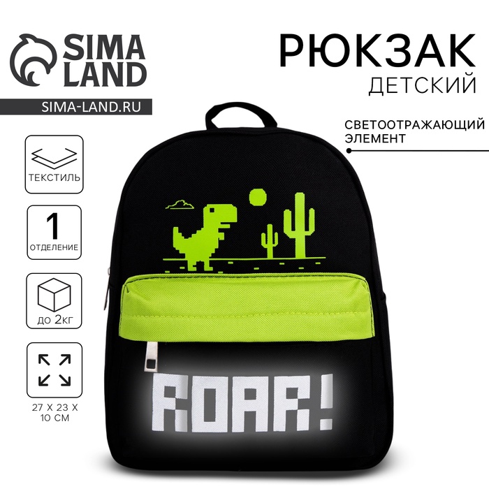 Рюкзак школьный текстильный c карманом «Динозаврик», светоотражающие элементы, 27×23×10 см
