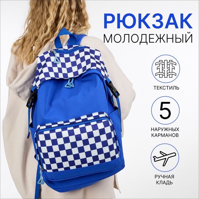 Рюкзак школьный на молнии, с карманами, в клетку, размер 29×15×40 см, синий