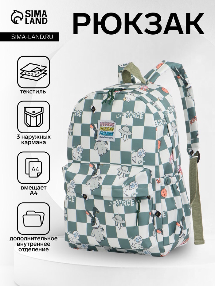 Рюкзак школьный на молнии, с карманами, в клетку, размер 28×11.5×40 см, зелёный