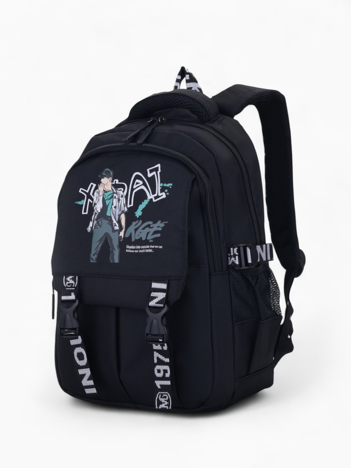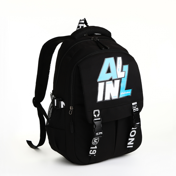 Рюкзак школьный на молнии, с карманами, принтом, размер 28×11×41 см, чёрный/голубой/белый