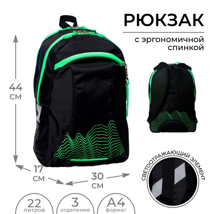Рюкзак молодёжный, 44 х 30 х 17 см, эргономичная спинка, Calligrata К "Волны", чёрный/зеленый