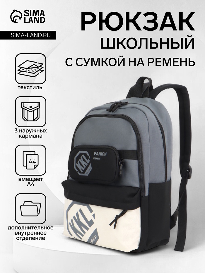 Рюкзак молодёжный с сумкой на ремень, с карманами, с принтом, размер 28×13×42 см, чёрный/серый