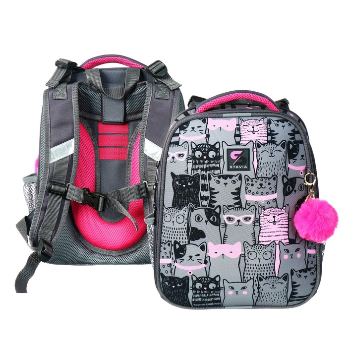 Рюкзак каркасный школьный 38×30×16 см, эргономичная спинка, Stavia «Кошачья семейка», серый