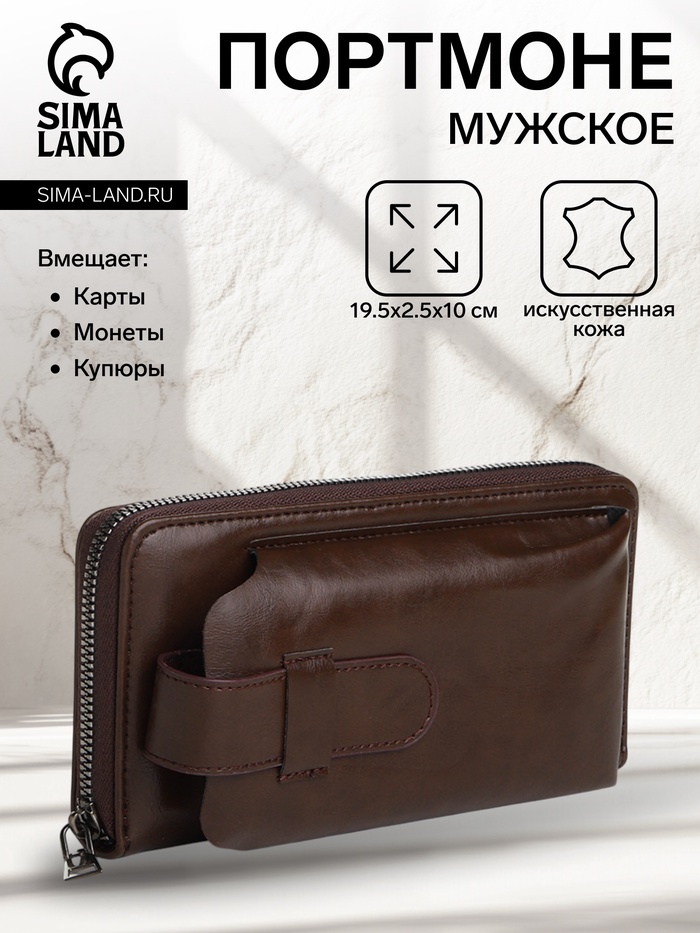 Портмоне мужское на молнии, отдел для телефона, карт, монет, цвет коричневый