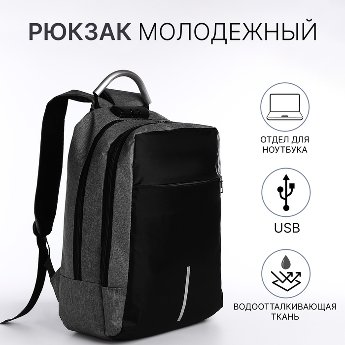 Рюкзак молодёжный из текстиля на молнии, 4 кармана, цвет чёрный/серый