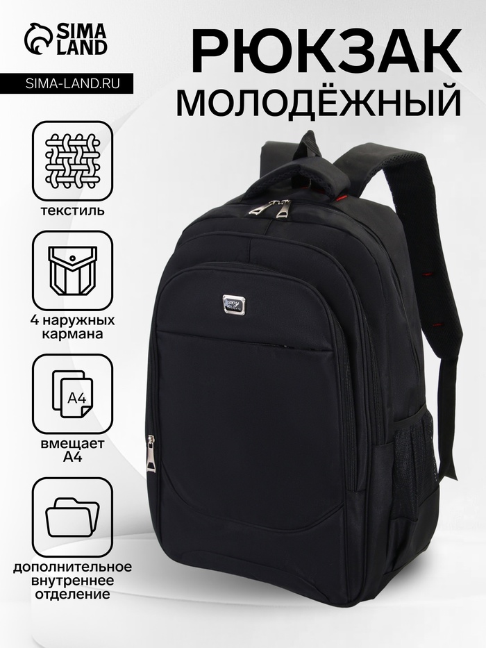 Рюкзак молодёжный из текстиля, 2 отдела на молнии, с карманами, размер 37×17×54 см, чёрный