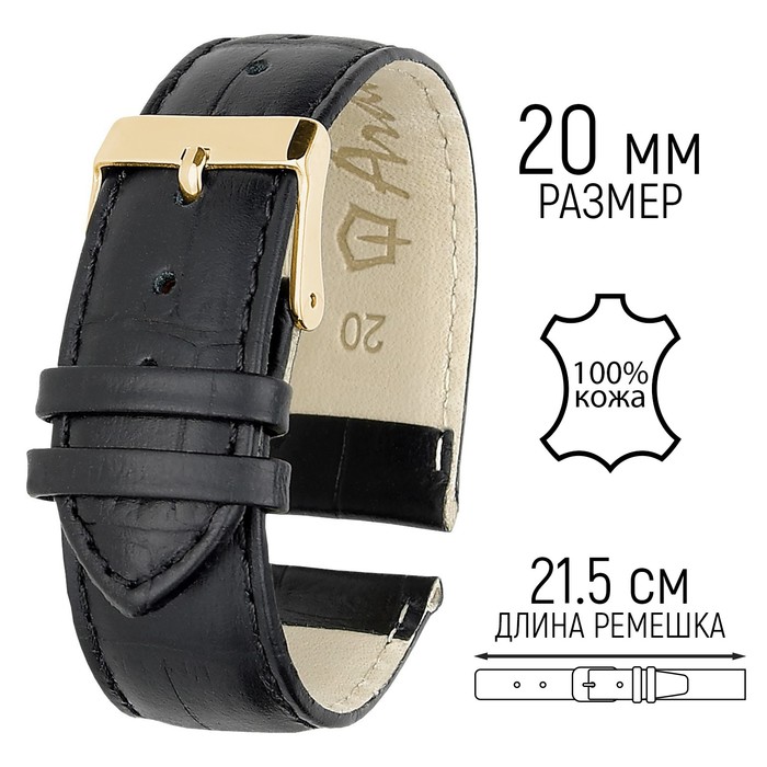 Ремешок для часов, 20 мм, натуральная кожа, чёрный