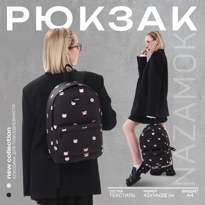 Рюкзак школьный текстильный «Коты», 42×14×28 см, чёрный