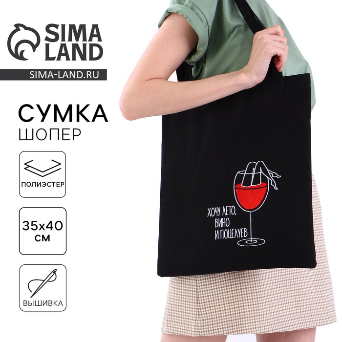 Шопер «Бокал вина», 35×0.5×40 см, вышивка, чёрный
