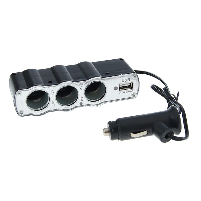 Разветвитель прикуривателя, 3 гнезда, 1 USB 0.5 А, 60 Вт, 12/24 В, провод 40 см