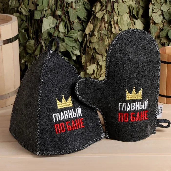 Набор для бани "Главный по бане" 2 предмета шапка, варежка с вышивкой