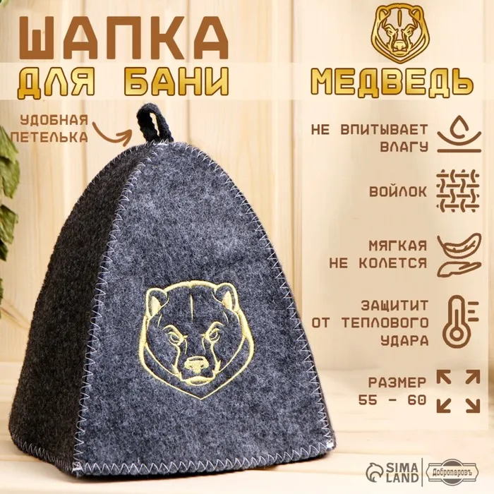 Шапка для бани серая с вышивкой "Медведь"
