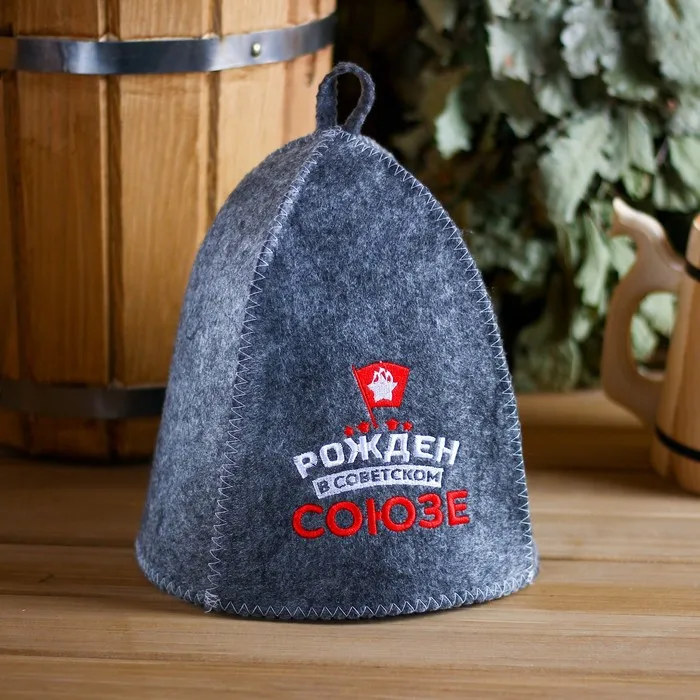 Шапка для бани с вышивкой из серого войлока "Рожден в Советском СОЮЗЕ"