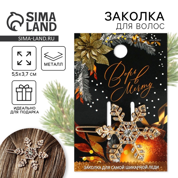 Заколка для волос новогодняя «Верь в мечту», снежинка, 5,5 х 3,7 см