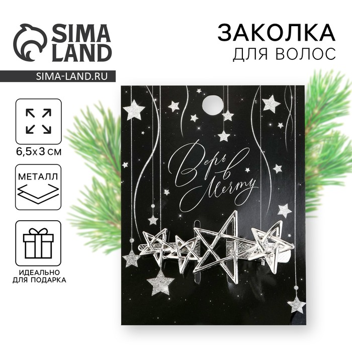 Заколка для волос новогодняя «Верь в мечту» звездочки, цвет серебро, 6,5 х 3 см