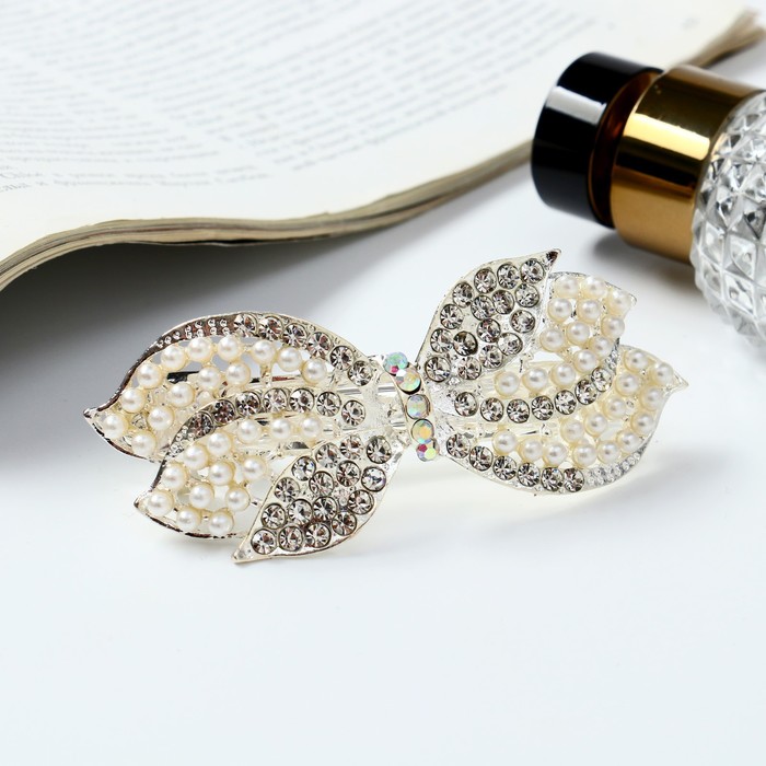 Заколка - автомат для волос «Гелая», бантик, 9 см, серебристо-белая
