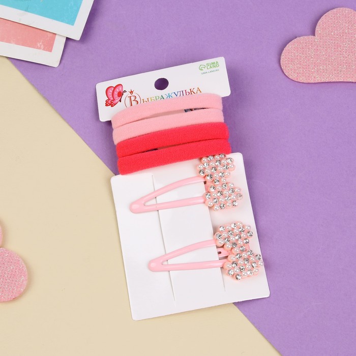 Набор для волос «Лили», 4 резинки 4 см, 2 невидимки 5 см, сердечки, розовый
