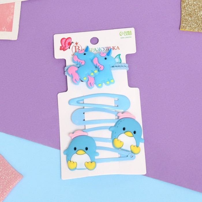 Набор для волос «Ширли», 2 резинки 5 см, 4 невидимки 5.5 см, единорог, голубой