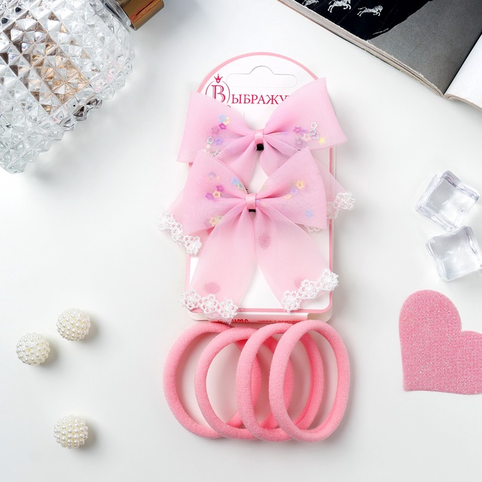 Набор для волос «Кокетка», 4 резинки 4 см, 2 зажима 6.5 см, кружева, розовый