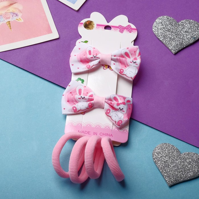 Набор для волос "Карапунька" (4 резинки, 2 зажима) зайка, 2 см, бело-розовый