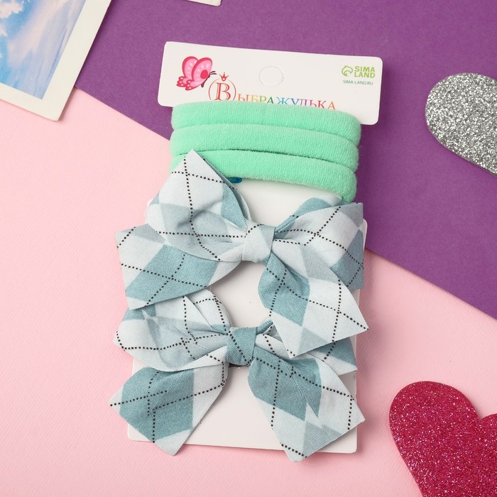 Набор для волос «Кокетка», 5 шт.: 3 резинки, 2 зажима, клетка, зелёный