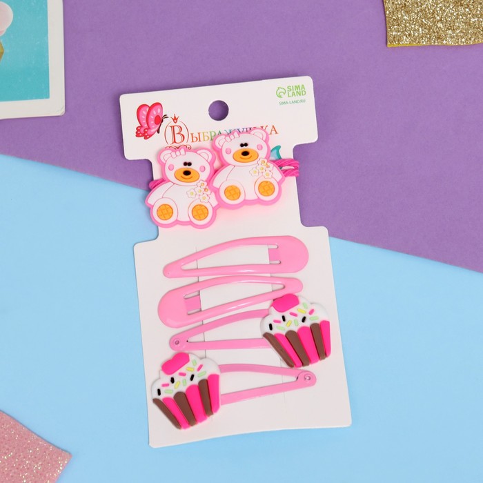 Набор для волос «Ширли», 2 резинки 5 см, 4 невидимки 5.5 см, мишка, розовый