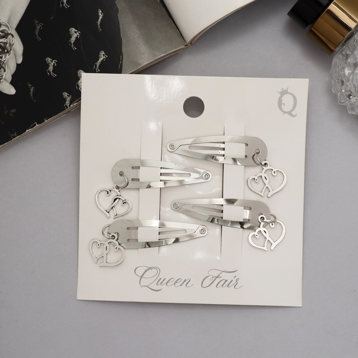 Невидимки для волос «Офелия», набор 4 шт., сердечки, 4.5 см, серебро