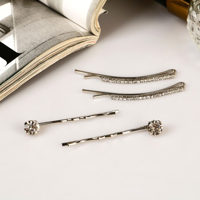 Невидимки для волос «Кварта», набор 4 шт., дорожка стразы, 5 см и 5.5 см, серебро
