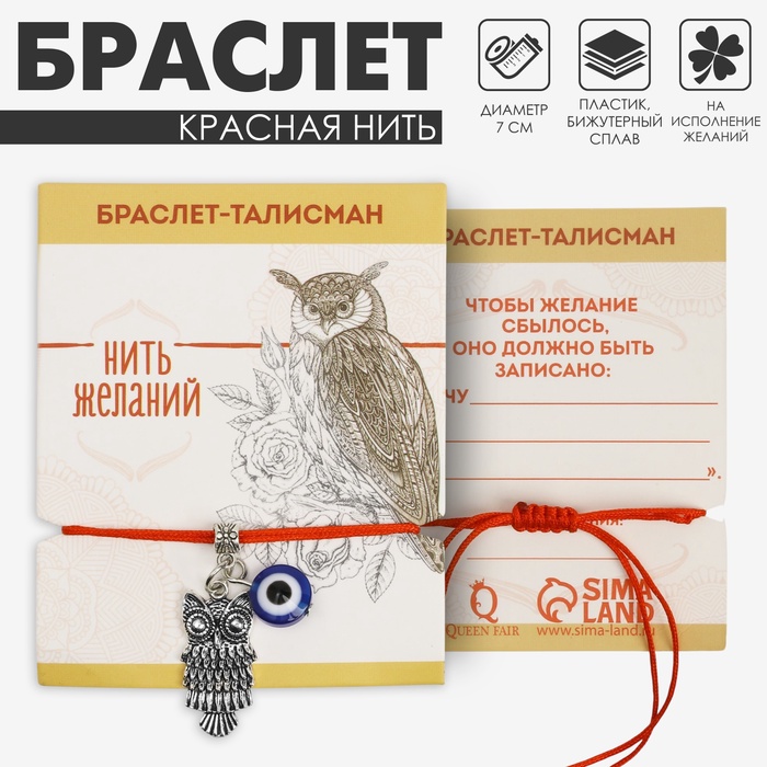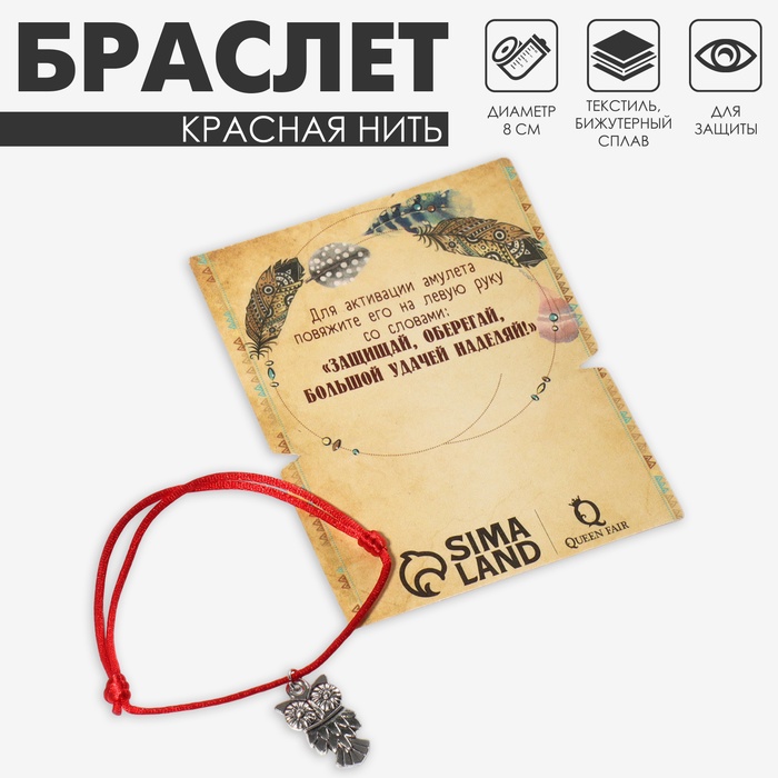 Браслет-оберег «Красная нить» талисман защиты, амулет сова, цвет серебро, d=8 см