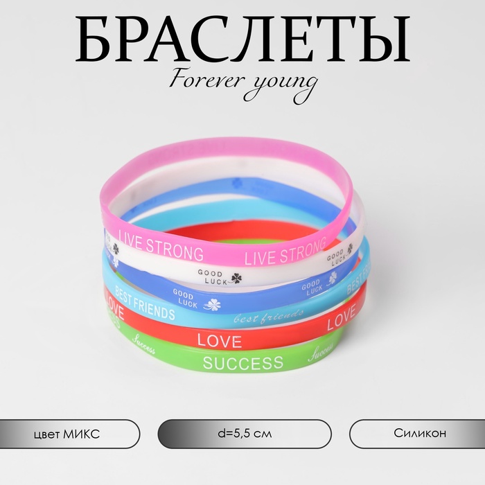 Силиконовые браслеты Forever young, набор 6 шт., цветные, d=5,5 см