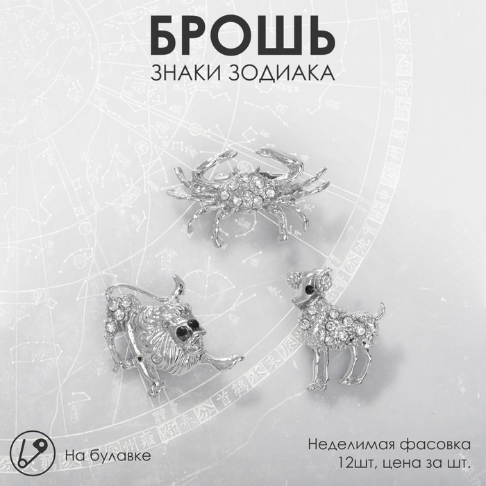 Брошь «Знаки зодиака» ассорти, гороскоп, цвет белый в серебре (неделимая фасовка 12 шт., цена за шт.)