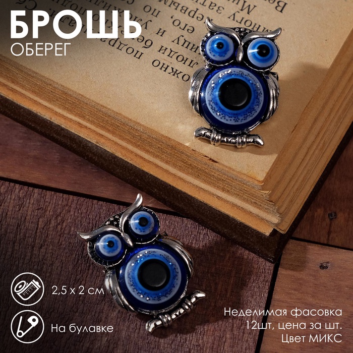 Булавка-оберег «Сова от сглаза», 6 см, цвет синий в серебре