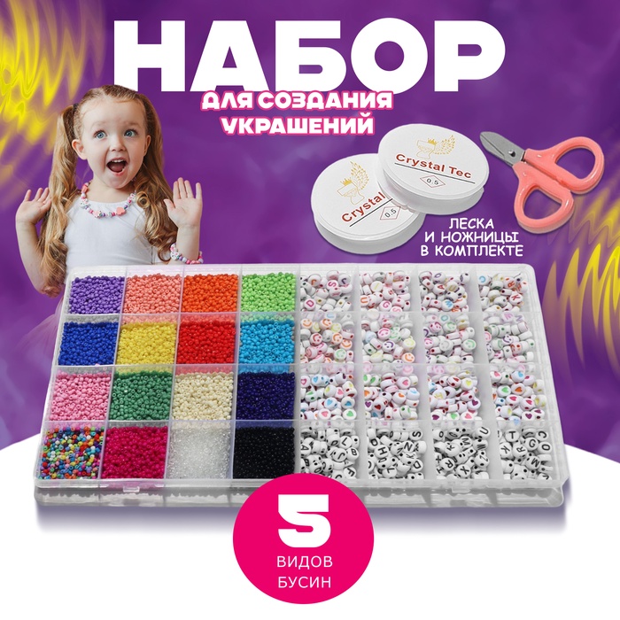 Набор для создания украшений «Радуга», 5 видов бусин, ножницы, 2 бобины лески 0,5 мм