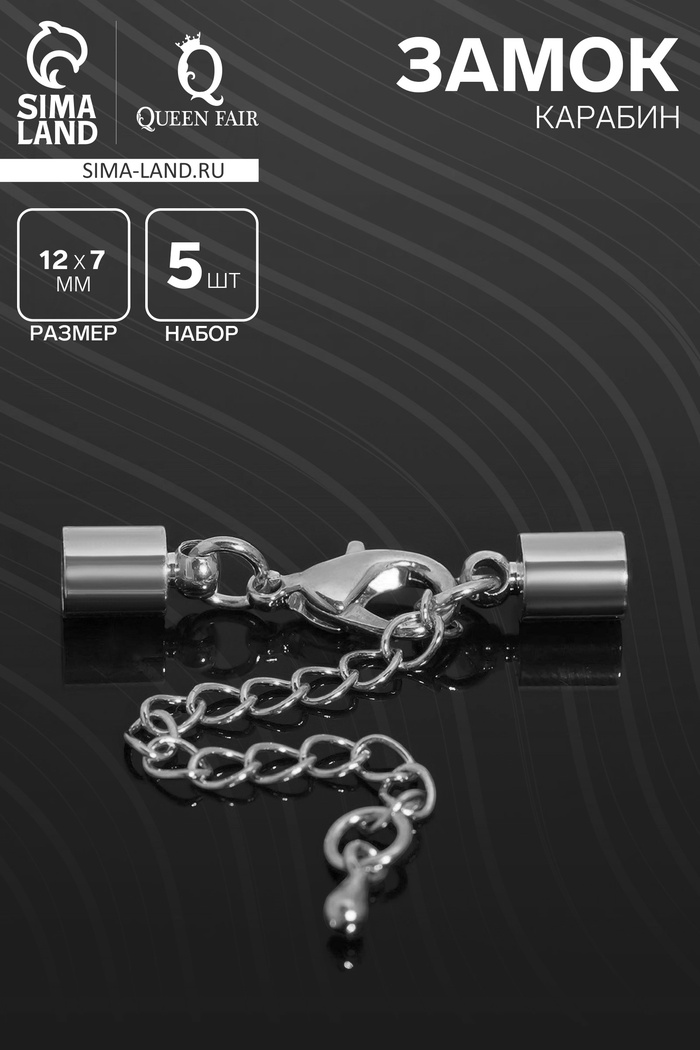 Замок-карабин (набор 5 шт.), 12×7 мм с удлинителем и обжимными круглыми концевиками 11×7 мм (внутренний 6,5 мм), цвет серебро