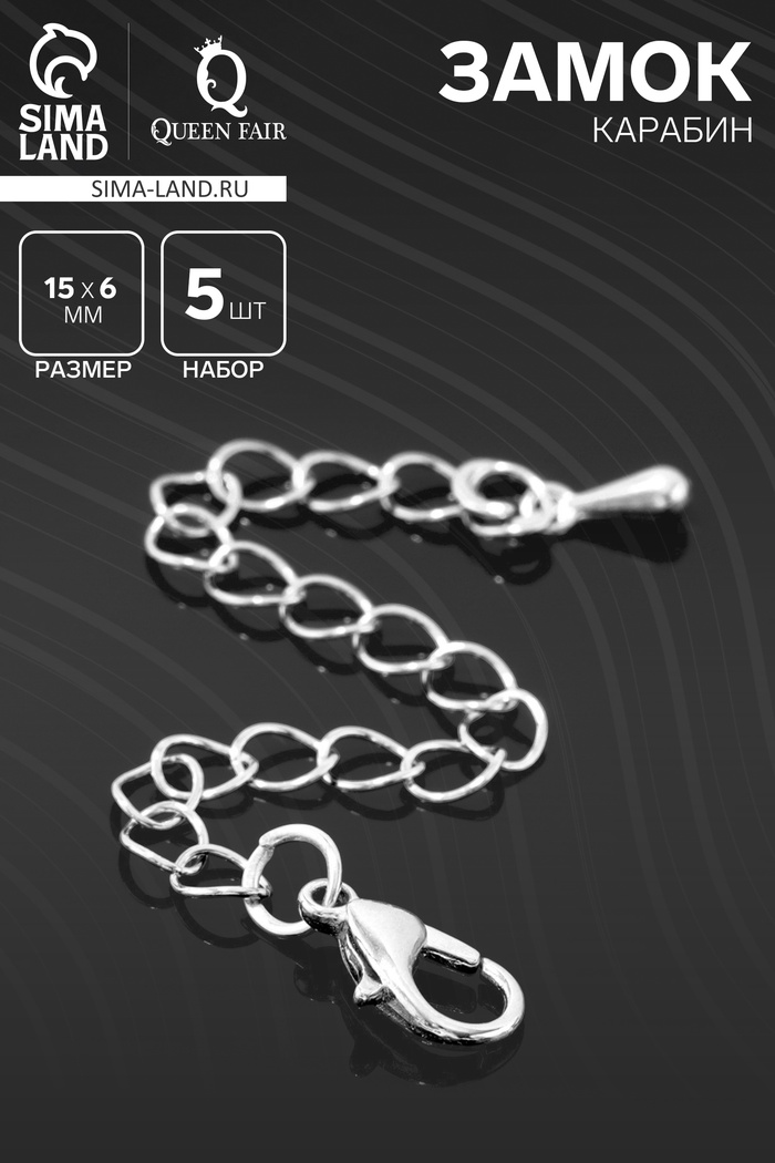 Замок-карабин СМ-951 (набор 5 шт.), 15×6мм, с удлинительной цепочкой 7,5см, цвет серебро