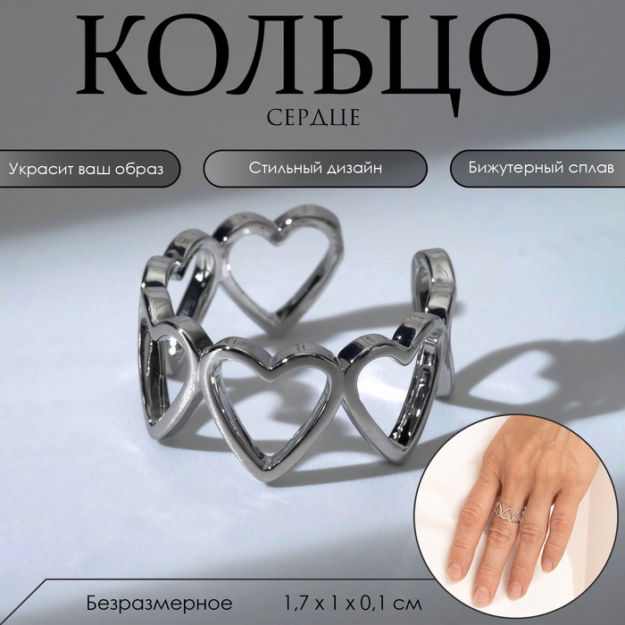 Кольцо «Сердце» ряд, цвет серебро, безразмерное